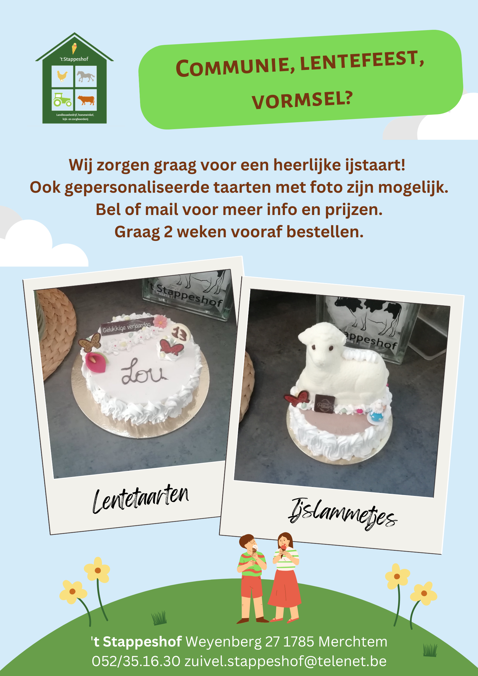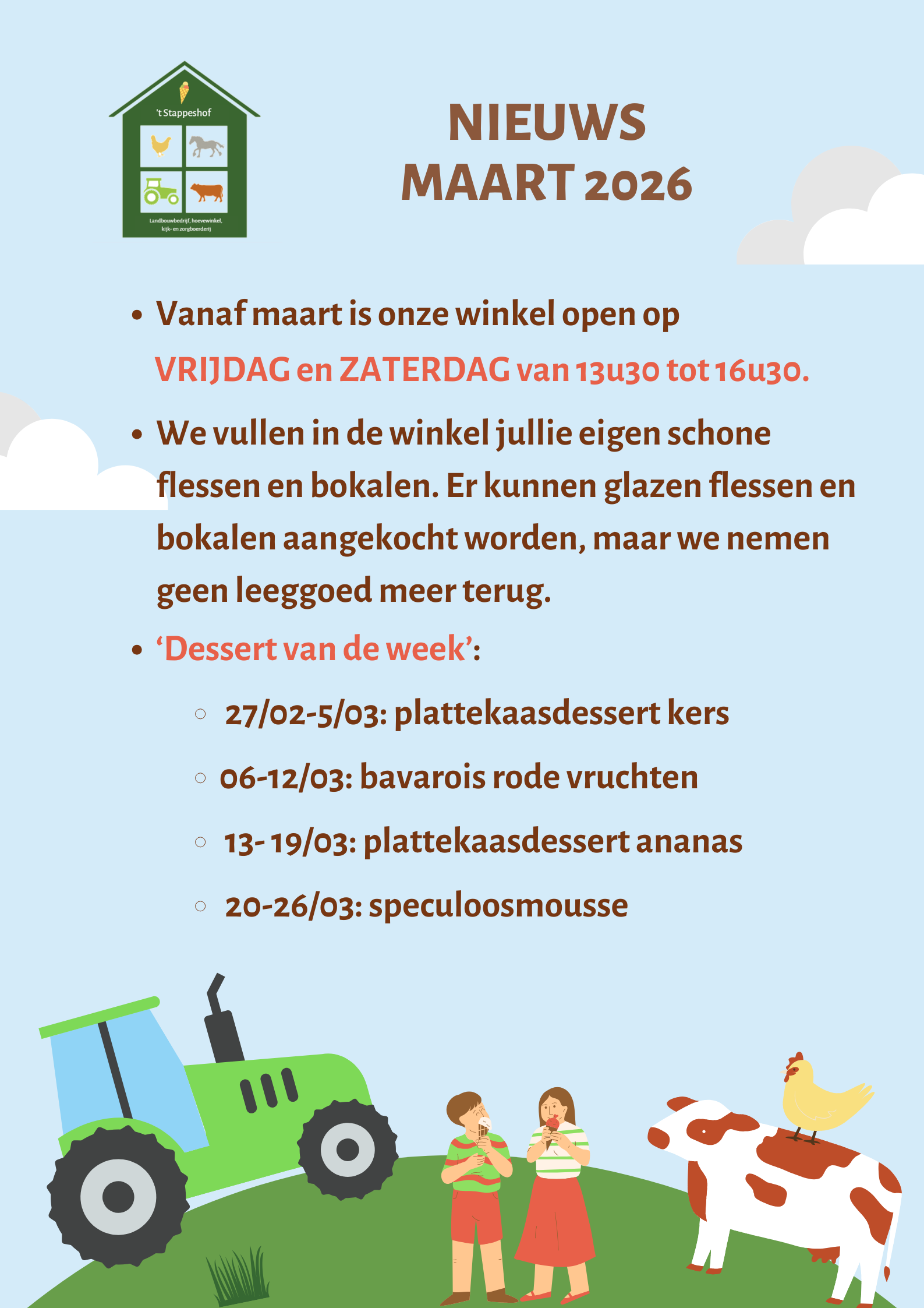 ‘t Stappeshof is een gemengd landbouwbedrijf gelegen in een landelijke uithoek van Merchtem, op de grens met Opwijk en Asse. Met 4 generaties wonen, leven en werken we op onze boerderij. In 1992 nam Hendrik het bedrijf over van zijn ouders en bouwde het uit tot het bedrijf dat we nu zijn. We hebben een 90-tal fleckviekoeien en telen het voeder voor onze dieren. Daarnaast hebben we ook nog braadkippen. Ook Riet werkt sinds 2007 voltijds mee op de boerderij. Sinds dan zijn we ook gestart als zorg- en kijkboerderij. In 2017 stapte dochter Lisa mee in het bedrijf en begon met de hoevewinkel.